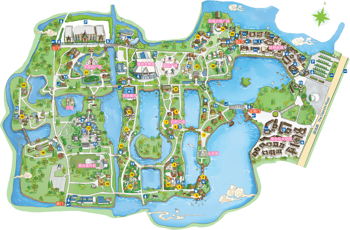 傣族人口約107萬(wàn)人,主要分布在云南的德宏傣族景頗族自治州、西雙版納傣族自治州及瀾滄江流域的河谷壩子區(qū)域。傣族寨是進(jìn)入民族村的第一個(gè)村寨,占地面積27畝,三面環(huán)水,綠樹(shù)掩映。一幢幢“干欄式”傣家竹樓,通過(guò)蜿延的紅砂石小徑聯(lián)向肅穆的緬寺。巍峨壯觀的白塔,精巧玲瓏的風(fēng)雨橋,以及風(fēng)雨亭、水井、鐘亭等建筑充滿(mǎn)著傣家的濃郁風(fēng)情,是傣寨真實(shí)的民間景觀再現(xiàn)。一年一度的“潑水節(jié)”期間,這里都有活潑歡快的“象腳鼓舞...