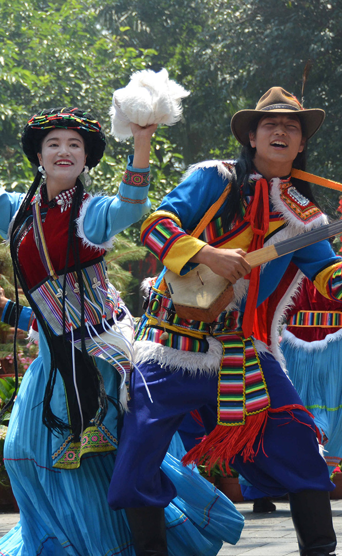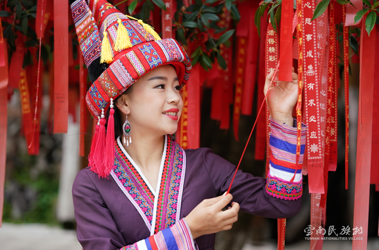彝族在云南境內(nèi)約471萬(wàn)人,是省內(nèi)人口最多、分布最廣的少數(shù)民族,主要聚居在金沙江、元江流域和哀牢山、無(wú)量山腹地。彝族是一個(gè)能歌善舞的民族,民間打歌、跳樂(lè)之風(fēng)盛行,大三弦、跌腳舞久負(fù)盛名。火把節(jié)是彝族最具特色的民族節(jié)日。彝族村占地50余畝,三虎浮雕墻與虎頭內(nèi)祖師形象表現(xiàn)了彝族虎鷹文化。太陽(yáng)歷廣場(chǎng)圖騰柱上有太陽(yáng)、虎、火和八卦圖形象,周?chē)h(huán)繞著10個(gè)朝向不同的月球造型,外圓周有12生肖石雕。依山而建的“...